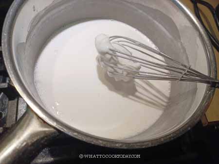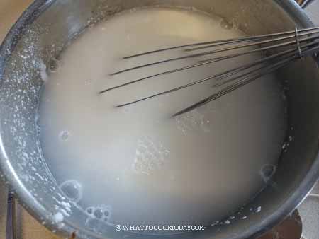 4. Turn off the heat immediately and remove from the heat and keep whisking. The batter will continue to thicken even after you remove from the heat and try to break the lumps but it’s okay if it’s not completely smooth. The batter will be lumpy (that’s ok, it will even out during steaming), and thicker but still a pourable consistency. Don’t cook until it thickens into a very thick paste or worst, a dough. The rice cake will be tough after steaming