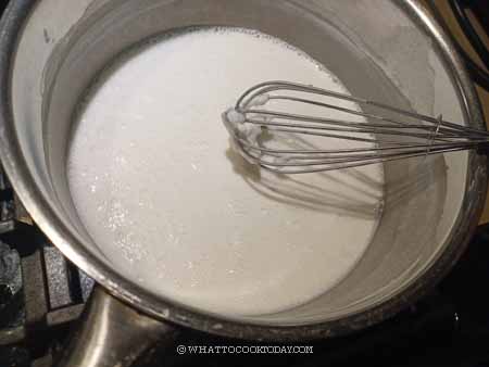- Put the pot on the stove and cook over low-medium heat. Continue to whisk until you start feeling some lumps forming at the bottom of the pot and some stuck to your whisk. Turn off the heat immediately and remove from the heat and keep whisking. The batter will continue to thicken even after you remove from the heat and try to break the lumps but it's okay if it's not completely smooth. The batter will be lumpy (that's ok, it will even out during steaming), a bit thicker but still a pourable consistency. Don't cook until it thickens into a very thick paste or worst, a dough. The rice cake will be tough after steaming