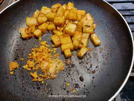 3. Push the rice cake to the side. Add minced garlic ,chye poh, chili paste and stir fry for about 1 minute.