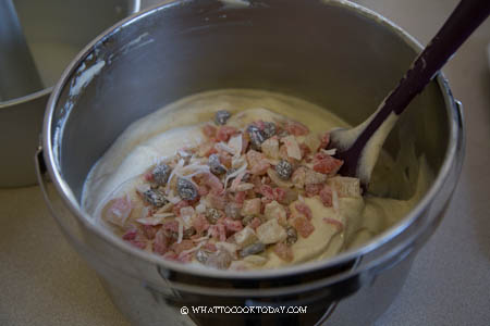 10. Fold in the dried fruit mix you prepared earlier as evenly as possible. Try not to overfold or the egg white meringue will lose too much air and the cake is running a risk of deflating during baking