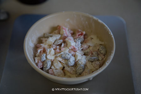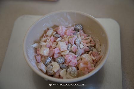 - Halve the maraschino cherries and then cut into quarters. Put the dried fruit mix in a bowl with the maraschino cherries. Add flour and toss to coat them well. Sift off excess flour and set aside. This step is to ensure our dried fruit mix won't sink to the bottom of the pan and distributed as evenly as possible