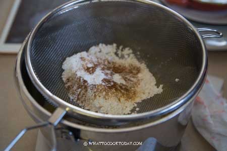 3. Sift off excess flour and set aside. Adding flour to the fruit mix is to ensure our dried fruit mix won’t sink to the bottom of the pan and distributed as evenly as possible