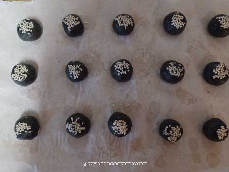 5. Scoop about 10 grams of cookie dough. Squeeze the dough and then roll into a round ball. This way, the cookies won’t crumble easily. Dip the top into some white sesame seeds. Place it on the prepared baking pan. Continue with the rest of the cookie dough. These cookies won’t spread or expand much
