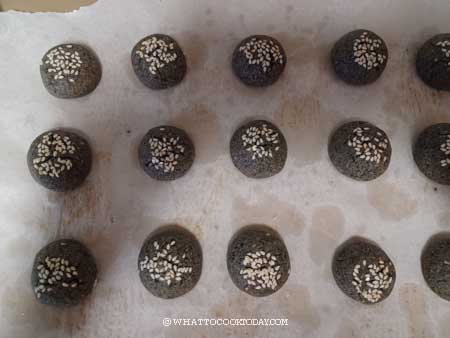- Scoop about 10 grams of cookie dough. Squeeze the dough and then roll into a round ball. This way, the cookies won't crumble easily. Dip the top into some white sesame seeds. Place it on the prepared baking pan. Continue with the rest of the cookie dough. These cookies won't spread or expand much