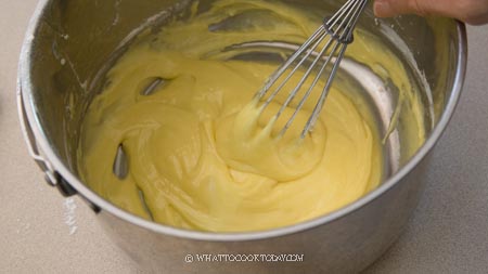 7. Continue with the next 1/3 and then the last 1/3. The final cake batter should be voluminous and airy. If it turns runny and not much volume, you have overmixed and lose most of the air, the cake will turn out dense and won’t rise