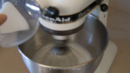 - Make sure your mixing bowl and other equipment are grease-free and clean. Use a whisk attachment to whip the egg white on medium speed (speed 4) until frothy, about 1 minute. Add the vinegar and whip again for another minute. Increase speed to 6 (medium) and gradually add sugar in 4 batches and continue to whip until you reach a stiff peak and then lower speed to 4 and beat one more minute so the air bubbles will be smaller. You can always stop halfway to check too. When you use a whisk to lift up the meringue, it should stay firm with just a slight bent on a tip and not moving. If you turn the bowl upside down, the meringue won't flop down