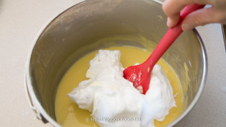 - Scoop 1/3 of the meringue into the cake batter. Use a whisk to gently swipe down and fold over to combine the meringue into the cake batter. Do this gently but quickly. Continue with the next 1/3 and then the last 1/3. The final cake batter should be voluminous and airy. If it turns runny and not much volume, you have overmixed and lose most of the air, the cake will turn out dense and won't rise
