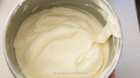 11. Make sure the heavy cream has been chilled in the fridge too. I like whipped cream stabilized with Jello instant pudding because the whipped cream is extremely stable, have a nice spongy texture, and it won’t “sweat” at all when you keep the frosted cake in the fridge or even if you leave the frosted cake out at room temperature for hours. Pour the heavy cream, icing sugar, and the Jello instant pudding mix into a mixing bowl. Start whipping at medium speed until it reaches a firm peak. It should be able to hold its shape. The texture will be smooth and glossy. If you whip too stiff, it will be grainy and not smooth. You know you have gone too far. Please note that you need to use the cream immediately or it will set if you make ahead and you won’t be able to frost the cake smoothly.