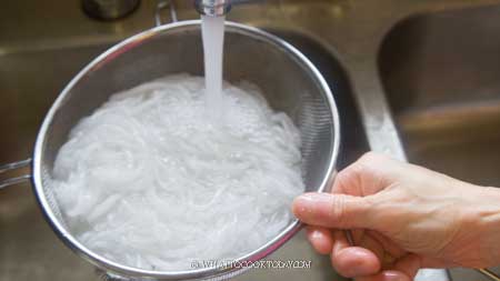 - When you are done cooking all the noodles, discard the soaking water and transfer the noodles to a colander and gently rinse the noodles with some cold running water to get rid of excess starch
