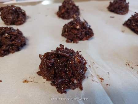 2. Whisk the egg whites with sugar, salt, vanilla, and cocoa powder until it’s smooth and no lumps from the cocoa powder. Add the coconut and chopped nuts and combine until all coconut are coated evenly with the batter