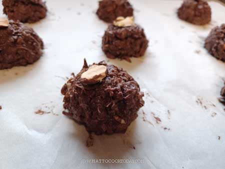 4. Preheat the oven to 350 F (180 C) for conventional oven, 330 F (165 C) for convection oven. Line two baking sheets with parchment paper. Remove the batter from the fridge and use a small ice cream scoop, the size is about 1 Tbsp. If you don’t have one, you can just use two spoons to help you shape. Scoop about 1 heaping tablespoon of batter and place the mound on the baking sheet, spacing about 2 inches in between. If you are using two spoons, try your best to form a mound
