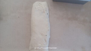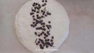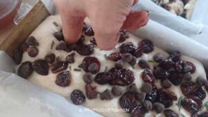 - Spread 1/4 of the chocolate chips, 1/4 of rosemary, and 1/4 of the soaked cherries (I forgot to include the cherries in this step-by-step photo) on the center of the rectangle.