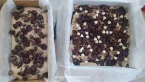 - Fold 1/3 of the dough over to cover and then spread another 1/4 of chocolate chips, 1/4 of rosemary, and 1/4 of soaked cherries on top.