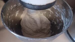 - Mix on the lowest speed for 1 minute to combine everything and then increase the speed to medium and beat until the dough sort of wrap around the beater and clear the sides of the bowl, still sticky, but very elastic. This shows that the gluten has well-developed