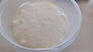 - I divide the dough into two and place in two separate container that I have oiled lightly. Cover and let them proof at a warm place, about 78-80 F (26-27 C). They should double in volume. This takes about 3 hours or so if you use sourdough starter and about 1 – 1 1/2 hours if you use instant yeast