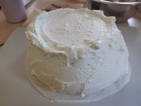 9. Lower the temperature to 200 F (93 C) for conventional oven, 180 F (82 C) for a convection oven. Place the baking sheet on the middle rack. Set the timer to 2 hours 30 minutes. DO NOT open the oven door during baking. When the time is up, turn off the oven but DO NOT open the oven door. Let the Pavlova cool down in the oven for at least 8 hours or overnight is fine too. Sometimes the meringue may crack a little, but it may not too. If it cracks a bit, I won’t worry too much