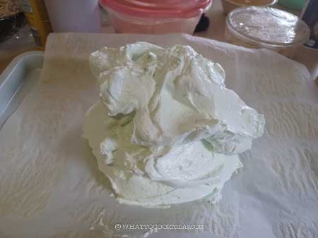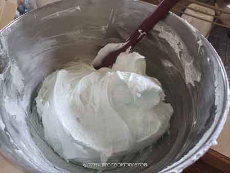 5. PREPARE MERINGUE. Beat the egg whites until they are foamy and white using a mixer (a stand mixer is best if you have one) I beat on speed 4 on KA. Gradually add the sugar mixture 2-3 tablespoons at a time and wait for about 20-30 seconds in between before adding the next. Once all the sugar is in, increase the speed to 6 and continue to beat until the meringue is glossy, thick and sugar has dissolved. You may need to stop halfway to scrape the sides of the bowl because some sugar sticks to the side of the bowl. This can take 10-15 minutes or even longer. Don’t rush the process. Use your clean fingers to feel the meringue. If you feel some grittiness, that means the sugar hasn’t completely dissolved yet. Continue beating. Add vinegar, peppermint extract, gel food color if using. Continue whipping for another minute or so. The meringue should be thick and glossy and can hold its shape and some sharp lines and very firm