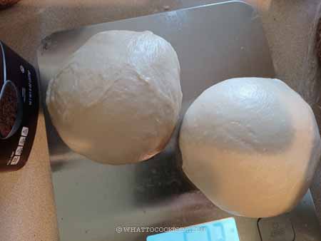 6. Place the two doughs in a lightly oiled large bowls. Cover them with a clean and damp tea cloth or plastic wrap and let them rise at a warm place for about 1 hour until the dough doubles in volume