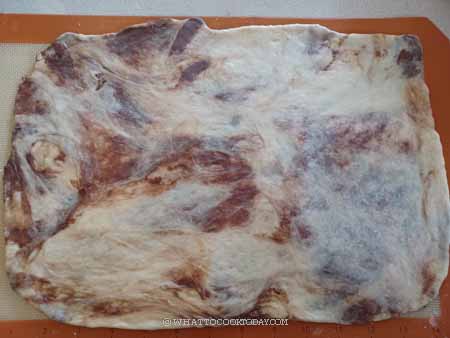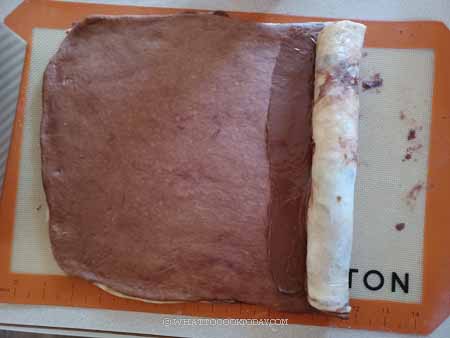 8. Roll each dough into about 10 x 14 inches rectangles, roughly! Try to keep them both roughly about the same size. You can see the chocolate chips had melted here in the white dough (so I recommend not to add them in just yet. It’s just too messy)