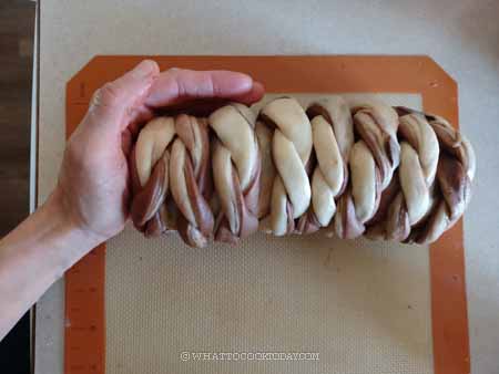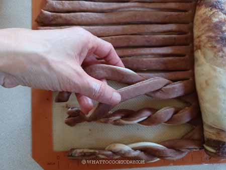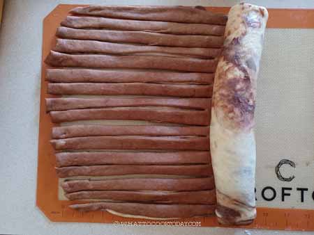 - Cut about 12-16 strips on the other half of the rectangle, roughly about the same size. Braid two strands together. Repeat with the rest. Then continue to roll the dough down tightly to prevent any gaps or holes later