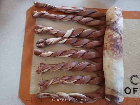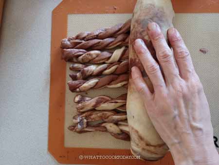5. Divide the dough into two equal portions. Return one portion of the dough into the mixing bowl. Add the cocoa powder and knead on the lowest speed just to get the cocoa powder to distribute. If the dough gets dry because of the cocoa powder, add a bit of milk, about 1/4-1/2 teaspoon of milk or as needed. It may not be 100% evenly distributed, but I won’t sweat it