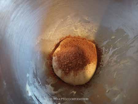 - Divide the dough into two equal portions. Return one portion of the dough into the mixing bowl. Add the cocoa powder and knead on the lowest speed just to get the cocoa powder to distribute. If the dough gets dry because of the cocoa powder, add a bit of milk, about 1/4-1/2 teaspoon of milk or as needed. It may not be 100% evenly distributed, but I won't sweat it