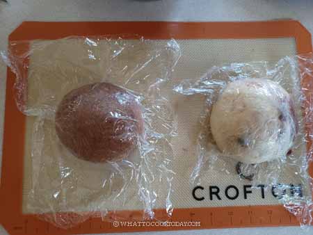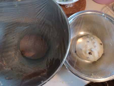 - Place the two doughs in a lightly oiled large bowl, separated by a piece of foil or parchment paper that I've sprayed with non-stick spray. Cover them with a clean and damp tea cloth or plastic wrap and let them rise at a warm place for about 1 hour until the dough doubles in volume