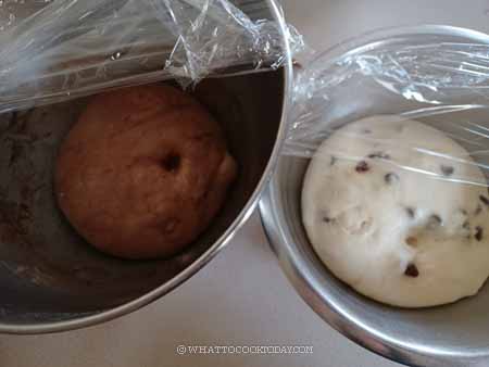 2. Mix all the dry ingredients in a mixing bowl, except for the cocoa powder and chocolate chips. I made a mistake by adding the chocolate chips to the white dough, which melted during proofing. We will add them later. Make a well in the center and pour in the wet ingredients and the tang zhong you made earlier. Use a dough hook attachment to knead the dough on speed 2 until all the crumbly dough starts to come together into one mass, it may take about 2-3 minutes for this to happen. Don’t be tempted to add any liquid. You may need to stop halfway and scrape the dough off the hook and the sides of the bowl and knead again several times