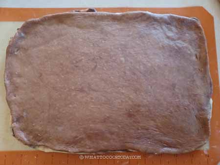 - Stack the chocolate dough on top of the white dough (or vice versa, it's up to you). Spread some Nutella or chocolate spread on half of the dough surface, then scatter the mini chocolate chips on top of the Nutella spread (I should have done this instead of adding them to the dough before the first proofing). Mini chocolate chips are better because they won't create big holes in your crumbs later. Roll the dough up halfway to cover the spread and chocolate chips