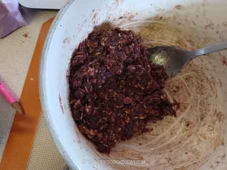 Combine softened butter, sugar, cocoa powder, coffee, a pinch of salt. Add the toasted oats and stir until they are thoroughly combined