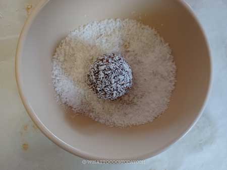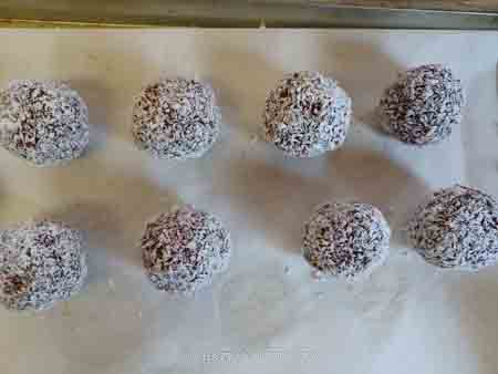 - Use a spoon to scoop about 1 tablespoonful (or more if you want it bigger in size) and roll into round ball. Coat in desiccated coconut and put on a small baking sheet lined with parchment paper