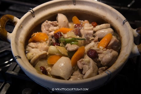 Chicken pieces are stewed in aromatics, Shaoxing wine, ginger, and red dates. Perfect as an easy weeknight meal or as part of a confinement diet. Can be cooked without clay pot too.