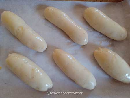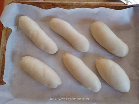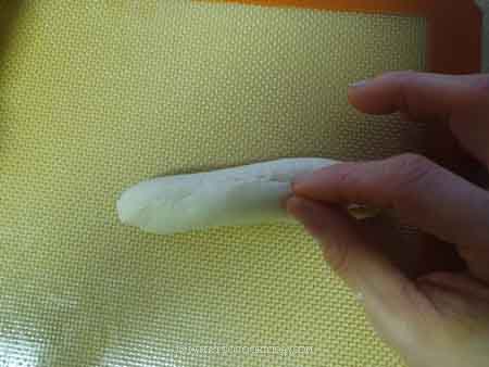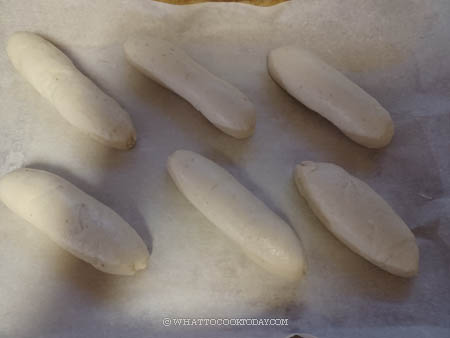 - Work with one dough at a time, use a rolling pin to flatten the dough into an oval shape, about 4-5 inches long and 3 inches wide. Roll from the long side to form a log. Pinch the seam side to seal. Place the seam side down on the baking pan