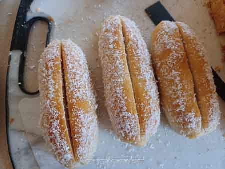 - Prepare a honey syrup by combining honey with hot water. Once the bread has cooled down completely, use a pastry brush to apply the syrup on the surface of the bun. Dip the bun into a plate filled with desiccated coconut. Use a serrated knife to make a cut on the center of each bun, taking care not to cut through the bun though.