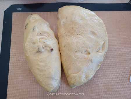 12. Cover with plastic wrap that has been lightly oiled to prevent sticking. Let the dough rise again at a warm place until about 50% puffy, this may take 45 minutes to 1 hour with SAF Gold instant yeast. It took about 40 minutes for me. If you use regular yeast this may take 2 hours or so. You don’t want the dough to puff up too much that it loses the shape, but it should be about 50% puffy and when you gently push on the dough, it bounces back very slowly and leave an indentation