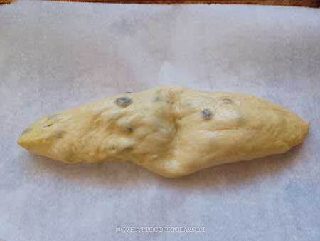 - Line a large baking sheet with parchment paper. Without deflating the dough yet, divide the dough into two pieces. Then gently flatten the dough slightly and shape it into about 10-inch log and the other about 7-inch log.
