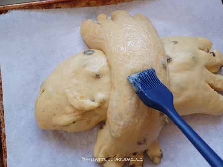 13. 10 minutes before the end of the final proofing, preheat the oven to 375 F (190C) for conventional oven, 350 F (180 C) for convection oven. Brush the dough with the egg white paste all over the surface. Arrange almond slices on top and add the coarse sugar. Use a whole almond for the eye (which I forgot LOL)