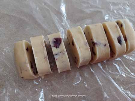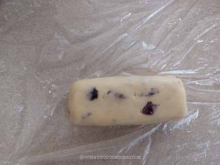 - Add the all-purpose flour and dried cranberries to one of the butter portions. Use a sturdy spatula to combine until no dry flour is visible. Form into a tight log about 2 1/2 to 3 inch diameter. If you want it square, you can use a bench scraper to help you shape it into a square shape instead. Wrap in a cling wrap and chill in the fridge for at least 1 hour or up to one week, about 1 month in the freezer