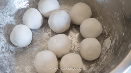 - Put one filling on the center and then gather the edge to seal and pinch off any excess dough. Roll into a smooth round ball. Make sure the dough ball is smooth. Dab your palms with a bit of water and roll the dough ball if the dough turns dry. Repeat with the rest of the dough and filling
