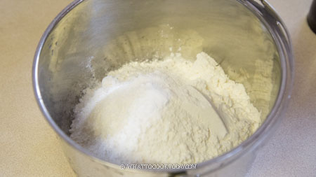 - Mix flour with salt. Add half of the water and start mixing. The dough will feel very dry at first. Gradually add water and keep mixing. For my case, even after I added all the water, the dough is still a bit at a dry side and there are still loose flour bits, but don't be tempted to add more water just yet. Keep kneading and try to knead into a rough dough ball. If it's still won't come together, add 1 Tbsp of water and knead again. This was all the water I need. You may need a bit more extra (all this depends on the humidity level and the type of flour you use). The dough is very rough and on the dry side, but as long as it can come together into one dough ball, don't add anymore water