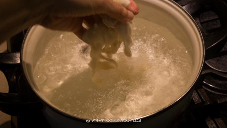 11. Add the noodles to the boiling water. Stir once to prevent the noodles from sticking, but don’t stir too much so you won’t break the noodles into tiny pieces. Let them cook for about 1 to 1 1/2 minutes. They don’t take long to cook