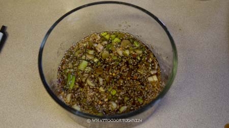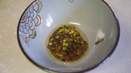 - Put all ingredients for the sauce in a heat-proof bowl, except for the 5 tablespoons of oil. It has to be heat-proof because we will be pouring hot oil over the ingredients later