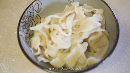 A professional chef can produce more than 200 shaved noodles in less than a minute! (wowza!!). They use a special knife that is made for this and extremely sharp. Me, on the other hand, no matter how sharp I sharpened the knife, it just won’t do LOL! So, instead of shaving the noodles directly into a pot of boiling water, I have to slice/cut the noodles, which, still fit into the idea of dao xiao mian 🙂