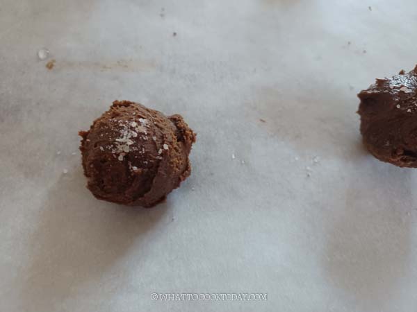 - I use a one-tablespoon size cookie dough scoop to scoop the dough. Put them about 1 1/2 to 2 inches apart on the baking sheets. Sprinkle with some sea salt flakes on top