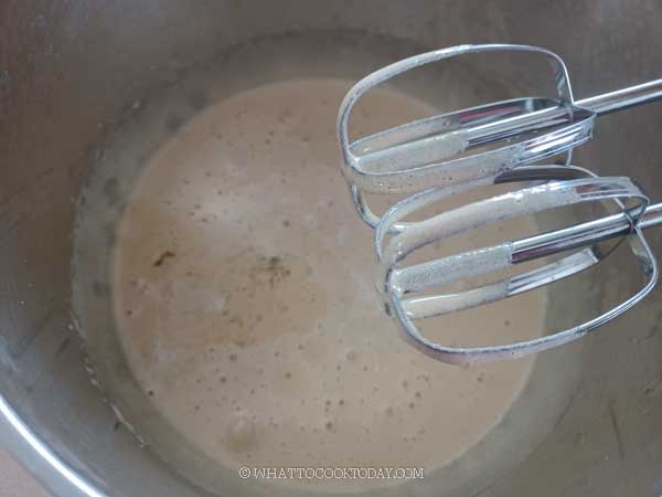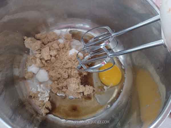 2. Preheat oven to 350 F (180 C). Position the rack 3rd from the top and another one 3rd from the bottom. Line two baking sheets with parchment paper and set them aside. Mix all the dry ingredients and whisk to combine. Put sugar, light brown sugar, and room temperature eggs in a mixing bowl. Beat with a mixer over high speed for about 3 minutes until light and fluffy