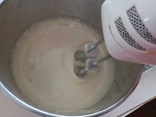 4. Lower the speed to the lowest and gradually add the dry ingredients so the flour mixture won’t fly around. Beat for about 30 seconds. The mixture won’t be fully combined yet. Switch to a sturdy rubber spatula and fold to mix
