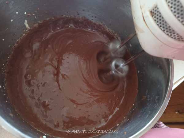 3. Lower the speed to low add rum, rum extract, and gradually add the warm chocolate mixture (make sure it’s not hot) and continue to mix. Then increase the speed to medium and beat another minute