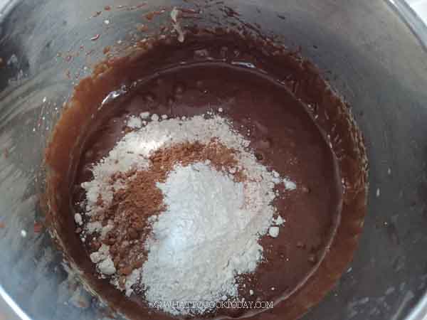 1. Melt the chocolate with butter over a bain-marie. Make sure the water is just simmering and not touching the bottom of the bowl you put the chocolate in. Set it aside to let it cool down as you prepare other things