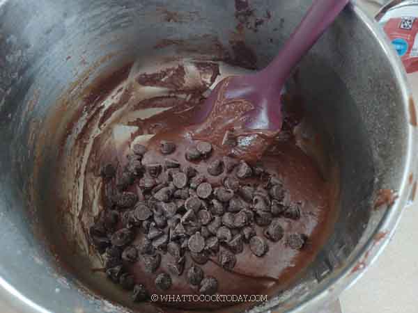 - Lower the speed to the lowest and gradually add the dry ingredients so the flour mixture won't fly around. Beat for about 30 seconds. The mixture won't be fully combined yet. Switch to a sturdy rubber spatula and fold to mix. Add the chocolate chips and fold to combine. Cover and chill in the freezer for 10 minutes.