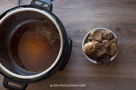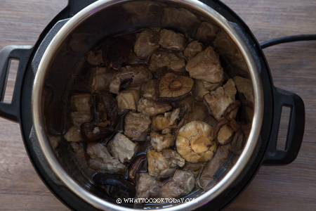 - Soak shitake mushrooms in warm water for 30 minutes. I like to use the soaking water later, but you can actually skip the soaking and place directly in the pressure cooker. Soak dried shrimp in warm water in a separate bowl for 15 minutes until soft. Discard liquid and rinse a few times with clean water